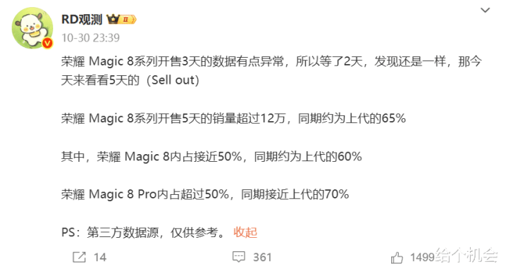 荣耀这两年在旗舰市场彻底跟不上了,新出的magic 8系列配置倒是提升很大 ,但销量却没达到预期,甚至比上代还更不好,据博主RD观测统计的销量数据显示,magic 8系列两款手机同期销量都没有上代多。